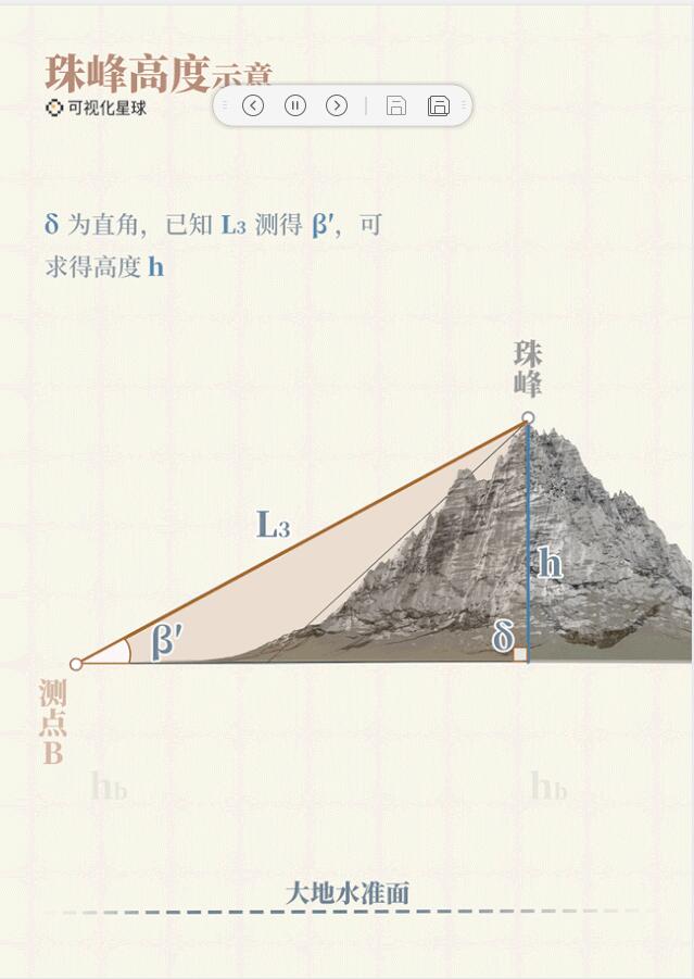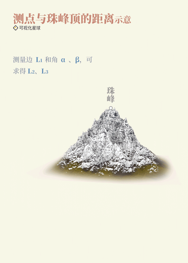 三角測量法中,首先要得到測點到珠峰頂?shù)木嚯x(下圖L3),再測得珠峰頂?shù)母叨冉牵ㄏ聢Dβ′),即可計算出珠峰高度。