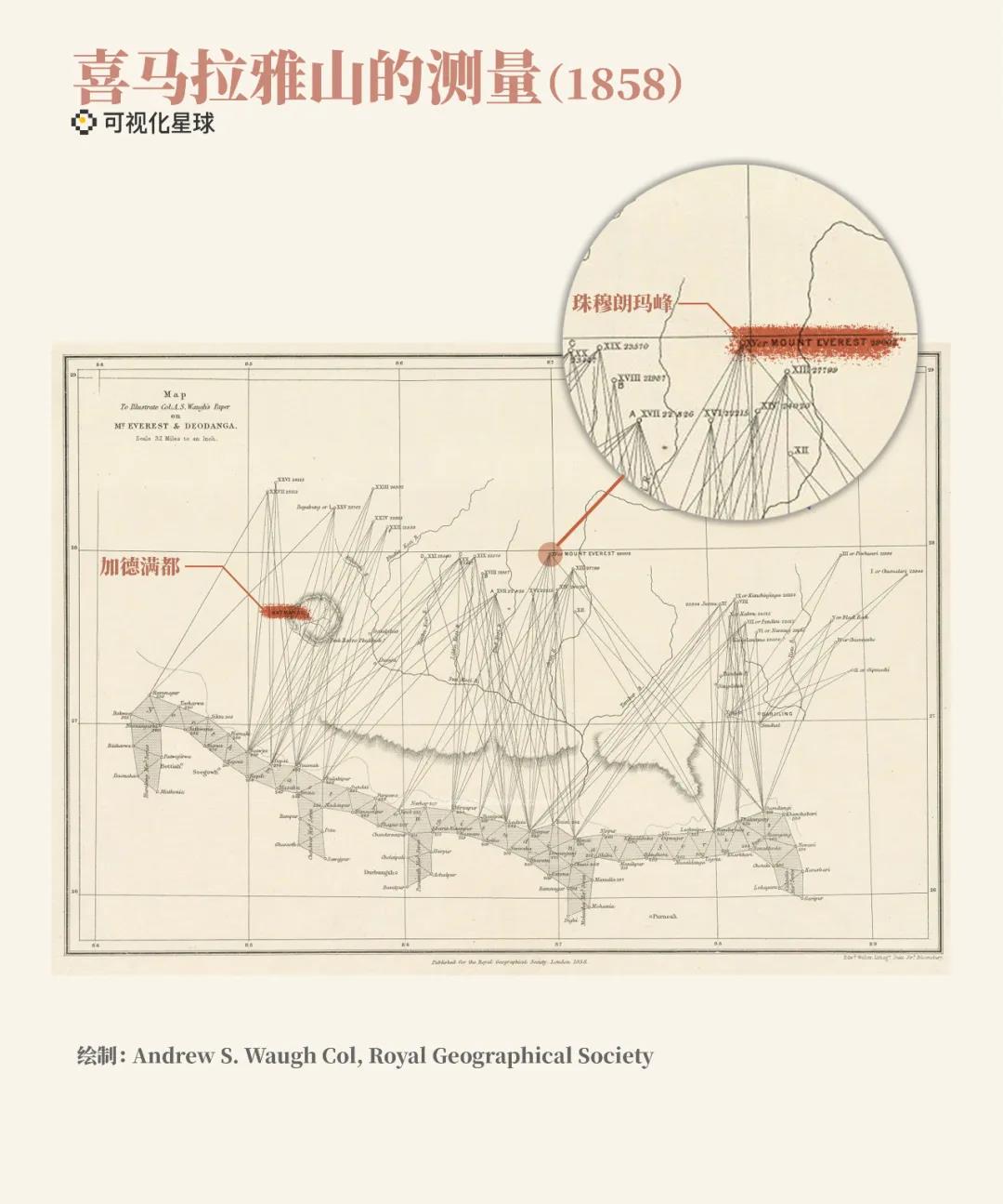 到了十九世紀(jì)中葉,英屬印度測量局對喜馬拉雅山脈進(jìn)行了廣泛調(diào)查與測量。在此過程中,他們發(fā)現(xiàn)并命名珠峰為Peak XV。之后,他們測量了珠峰高程并改名Mount Everest,珠峰的高度開始為世人所知。