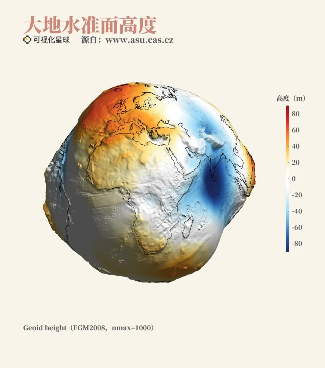 為了應(yīng)用方便,我們常用似大地水準(zhǔn)面作為替代。網(wǎng)上被廣泛傳播的“地球真實的形狀”就是對大地水準(zhǔn)面形狀的模擬,顯示了各地似大地水準(zhǔn)面相對于橢球體的高度。
